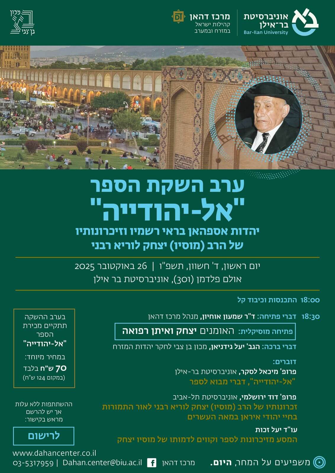ערב השקת הספר ״אל-יהודייה״ יהדות אספהאן בראי רשמיו וזכרונותיו של הרב (מוסיו) יצחק לוריא רבני יום ראשון | ד׳ חשון תשפ״ו | 26 באוקטובר 2025אולם פלדמן (301), אוניברסיטת בר-אילן להרשמה לתוכנית הערב אירועים אחרונים ספרים על קהילות ישראל ספרים נוספים פרס ראש הממשלה מוענק למרכז דהאןלחץ כאןכינוס בינלאומי ישראל - מרוקולחץ כאןכנס פורטוגללחץ כאןכנס יהודי קוצ׳ין לחץ כאןכנס בגאורגיהלחץ כאןכנס ישראל נג׳ארהלחץ כאןכנס הרמבם השלישי לחץ כאןכנס דרום אפריקה, ערב הפתיחהלחץ כאןכנס יהודי בבל לחץ כאן הצטרפו לקהילת מרכז דהאן וקבלו עידכונים שוטפים על האירועים שלנו! שם דוא״ל להצטרפות לקהילה שלנו